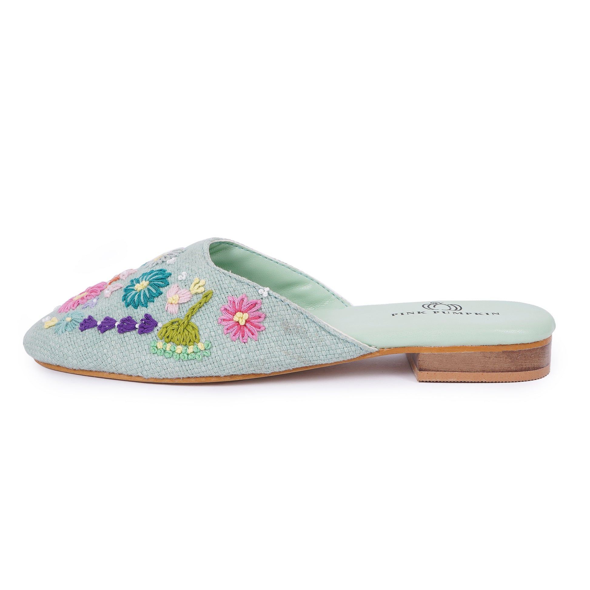 Step into elegance with Pink Pumpkin’s Handcrafted Embroidered Mules! These stylish slip-ons feature intricate floral embroidery on a soft pastel green fabric, making them a perfect blend of comfort and sophistication. Designed with a low wooden heel and a padded insole, they provide all-day ease while adding a touch of artisanal charm to your outfit. Ideal for both casual and festive occasions, these mules are a must-have in your wardrobe!