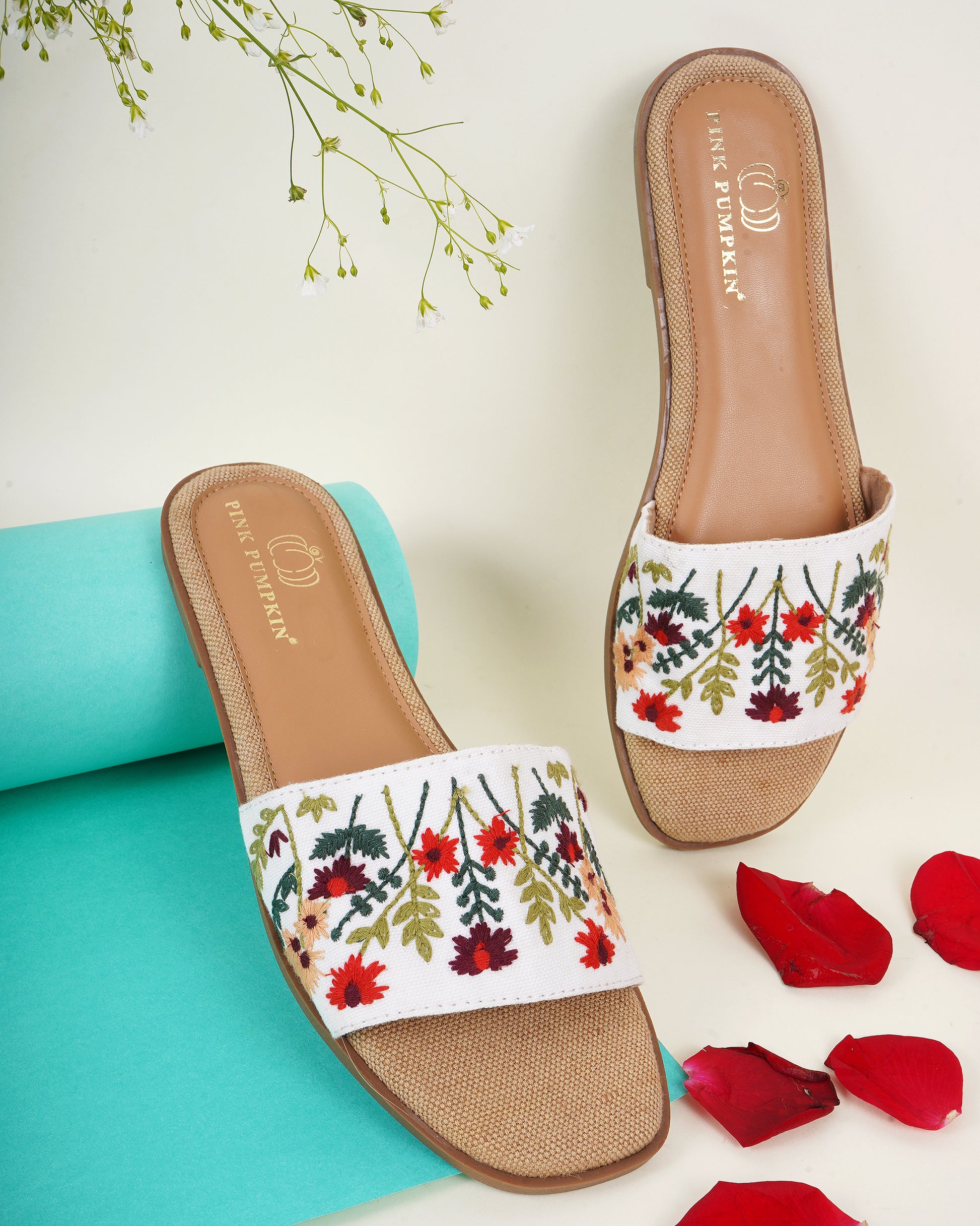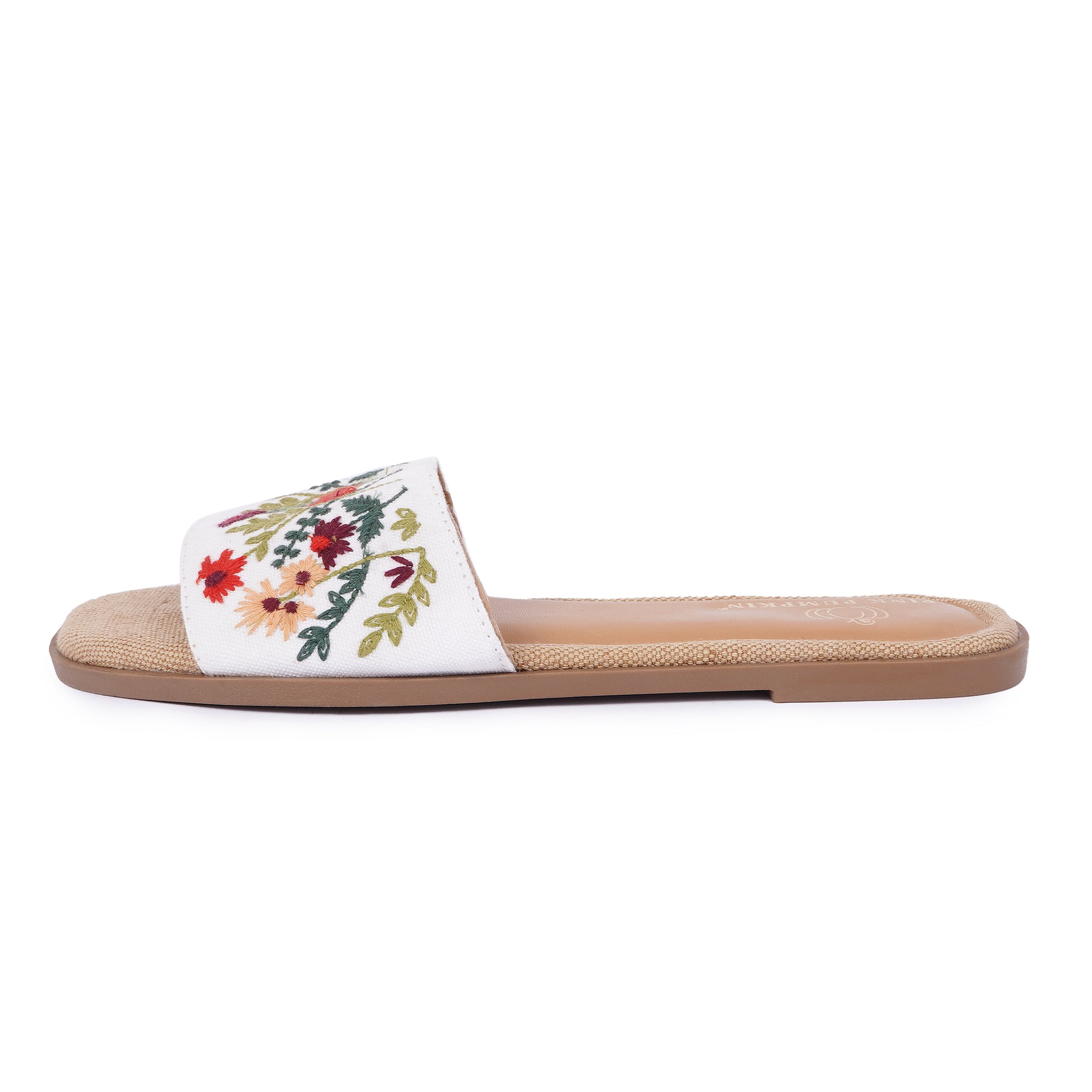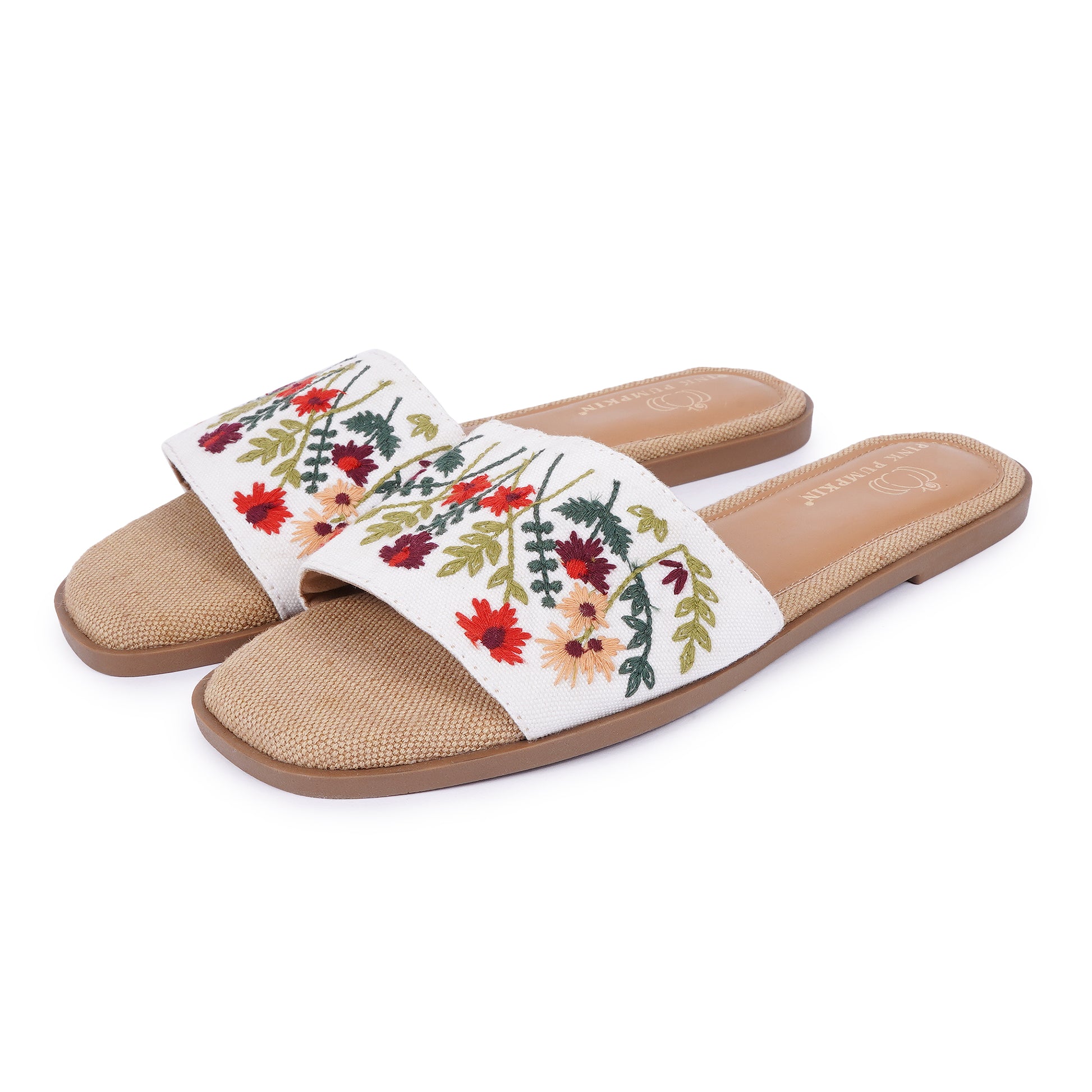 Step into elegance with Pink Pumpkin’s Floral Embroidered Slip-Ons! Designed for comfort and style, these handcrafted slides feature intricate multicolor floral embroidery on a soft white base. The natural jute-textured sole adds a rustic charm, making them perfect for casual outings or breezy summer days. Lightweight and stylish, these slip-ons are a must-have for effortless everyday fashion!